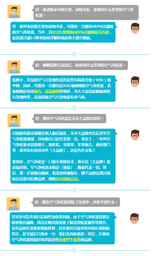 要挑選一台適合自己家居的商用淨化器,最好的方法是詢問專業人士的意見,可是如果身旁沒有專業人士怎麽辦﹖那就更要多多關注樱桃视频大全免费樱桃视频大全免费公司的專業技術資訊了。 在選擇空氣淨化器前,首要清楚自己的需要。市麵上有針對不同需要的空氣淨化器,如高密度過濾網式(HEPA)、紫外線殺菌式、光催化式、負離子式等,很多人都不清楚應該挑選類型的空氣淨化器。樱桃视频大全免费把一些常見問題列舉如下﹕