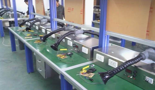 | 外排和室內淨化簡述: (1):外排方式: 整體布管根據實際情況使用不同的風機,通過分次布管接到各個焊錫工位,通常主管直徑在30CM左右,分到次管直徑為5CM到10CM之間,前麵也需要加上喇叭口之類的吸煙罩以達到更好的吸煙效果,風機功率在7.5千瓦左右。一個7.5千瓦風機能帶上20個左右焊錫工位![樱桃小视频三级片] (2):通過煙霧淨化設備淨化後直接在室內排放: 采用煙霧淨化設備直接將煙霧廢氣完整的吸過來,經過淨化處理達室內空氣質量標準,可直接在室內排放。