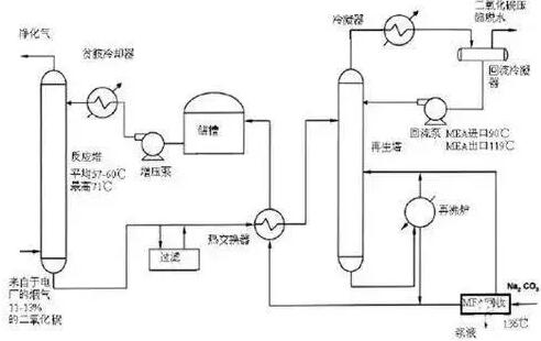 主要工藝原理: 工藝流程主要由三部分組成:以吸收塔為中心,輔以噴水冷卻及增壓設備;以再生塔和再沸器為中心,輔以酸氣冷凝器以及分離器和回流係統;介於以上兩者之間的部分,主要有富酸氣吸收液、再生吸收液換熱及過濾係統。 從爐後經除塵、脫硫後引來的煙氣溫度約為50℃,經設置在CO2捕集裝置吸收塔前的旋流分離裝置將煙氣中的石膏液滴脫除並降塵,然後進入煙氣冷卻器中與循環冷卻水換熱,使其溫度降到~40℃,達到MEA理想吸收溫度,通過氣水分離器除去遊離水後經增壓風機加壓後直接進入捕集裝置吸收塔進行CO2吸收[煙霧淨化機]。 設置煙氣預處理係統,脫除煙氣脫硫後攜帶的粉塵、水等雜質對係統的長期穩定運行有利,同時使用抗氧化劑和緩蝕劑,吸收劑消耗低,設備腐蝕小。增壓風機用來克服氣體通過捕集裝置吸收塔時所產生的阻力。 在捕集裝置吸收塔中,煙氣自下向上流動,與從上部入塔吸收液形成逆流接觸,使CO2得到脫除,淨化後煙氣從塔頂排出。由於MEA具有較高的蒸汽壓,為減少MEA蒸汽隨煙氣帶出而造成吸收液損失,通常將吸收塔分成兩段,下段進行酸氣吸收,上段通過水洗,降低煙氣中的MEA蒸汽含量。